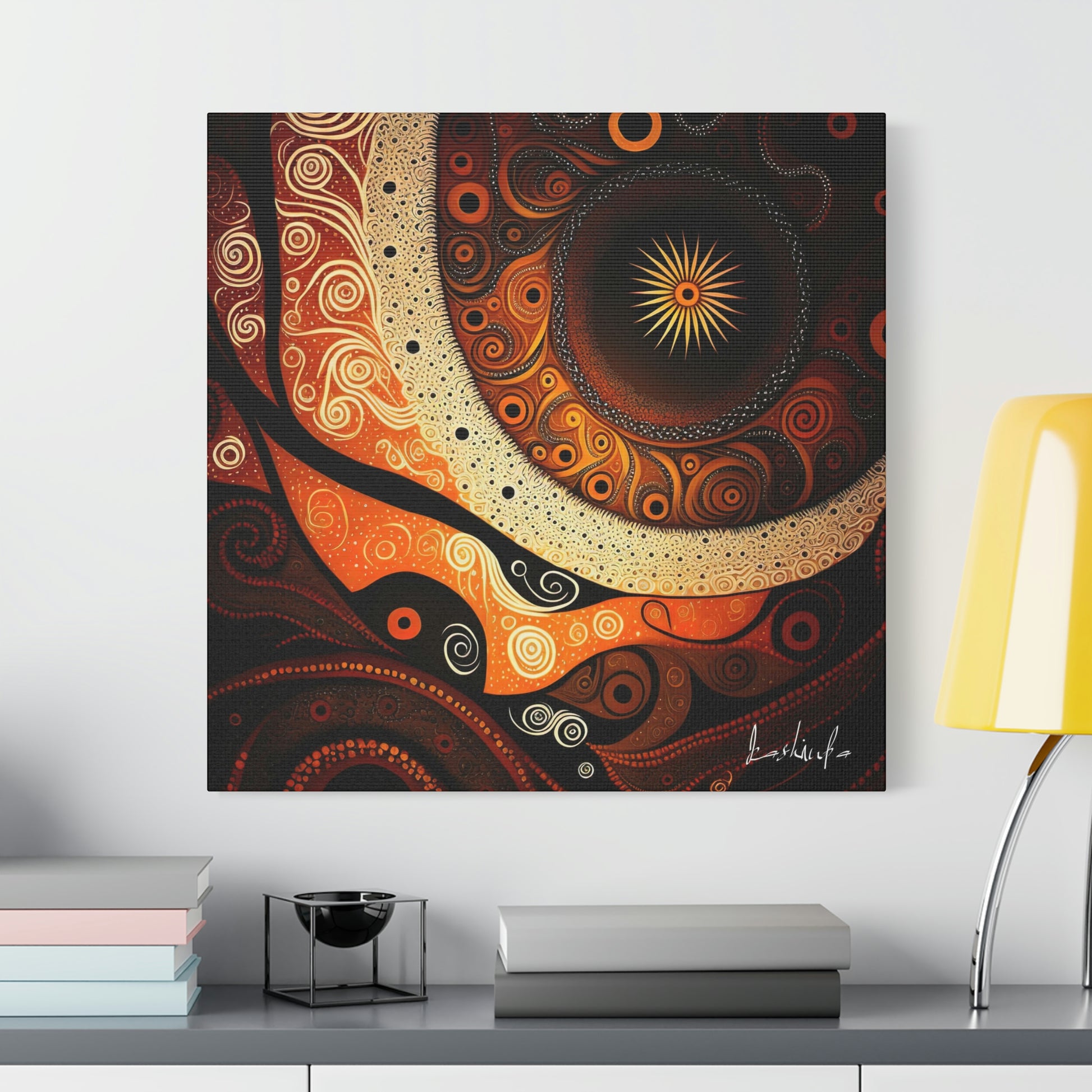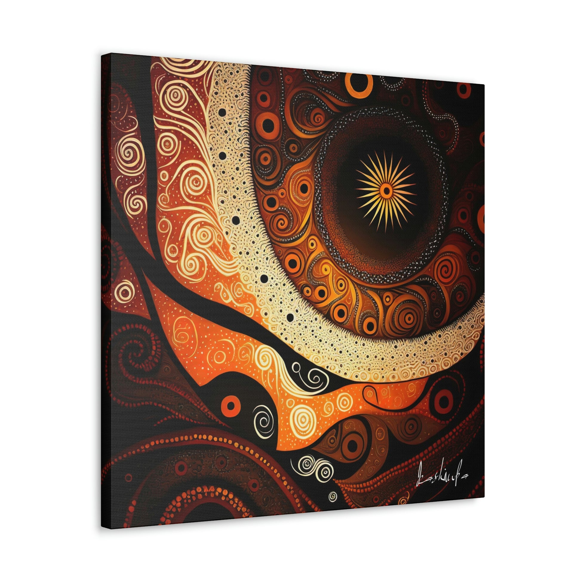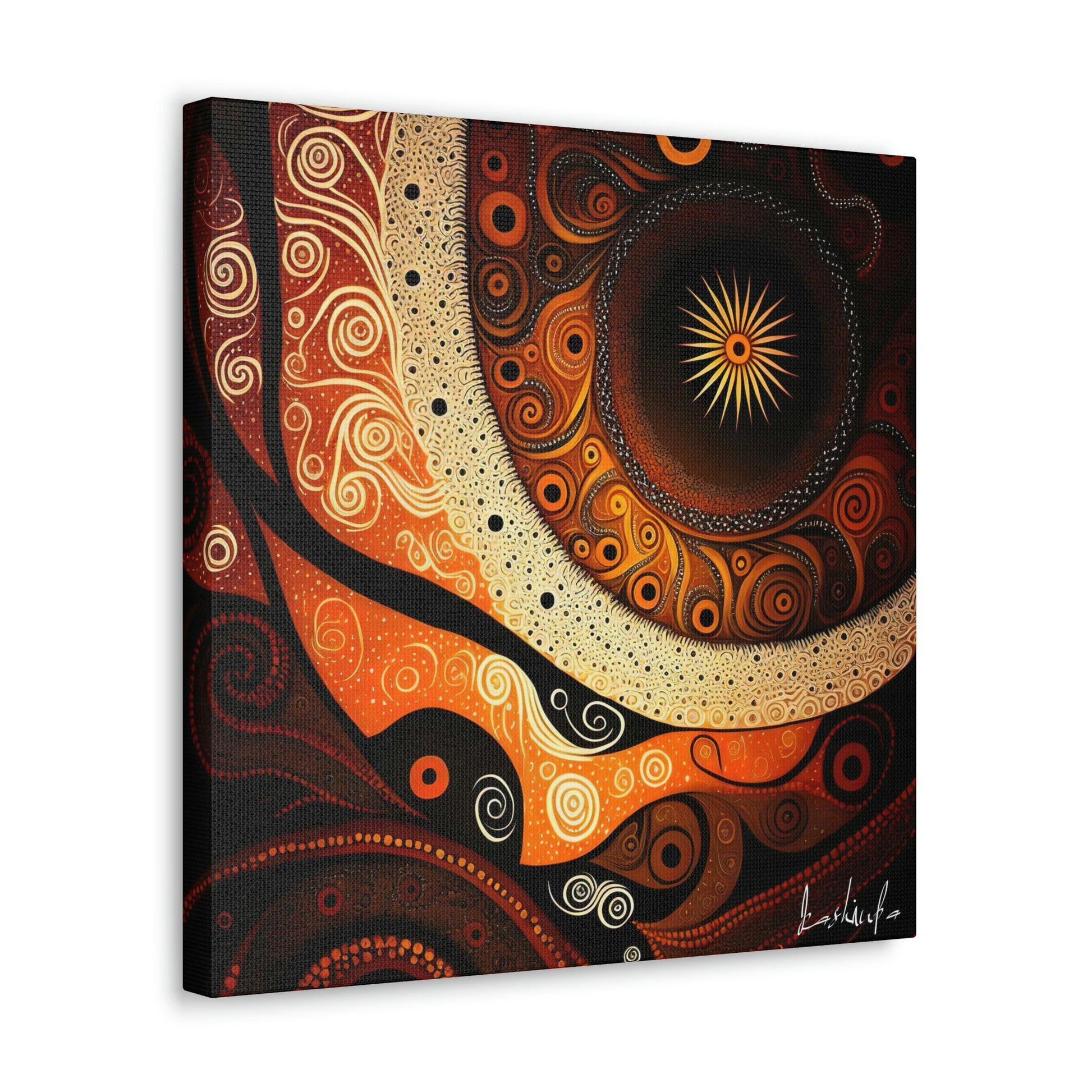 The painting is characterized by rich, deep soil colors and shades, which are used to symbolize the connection between the land and the spirit world. The intricate designs and patterns are a celebration of the spiritual stories and traditions passed down through generations, and serve as a visual representation of the Dreamtime, a sacred time in Aboriginal culture.