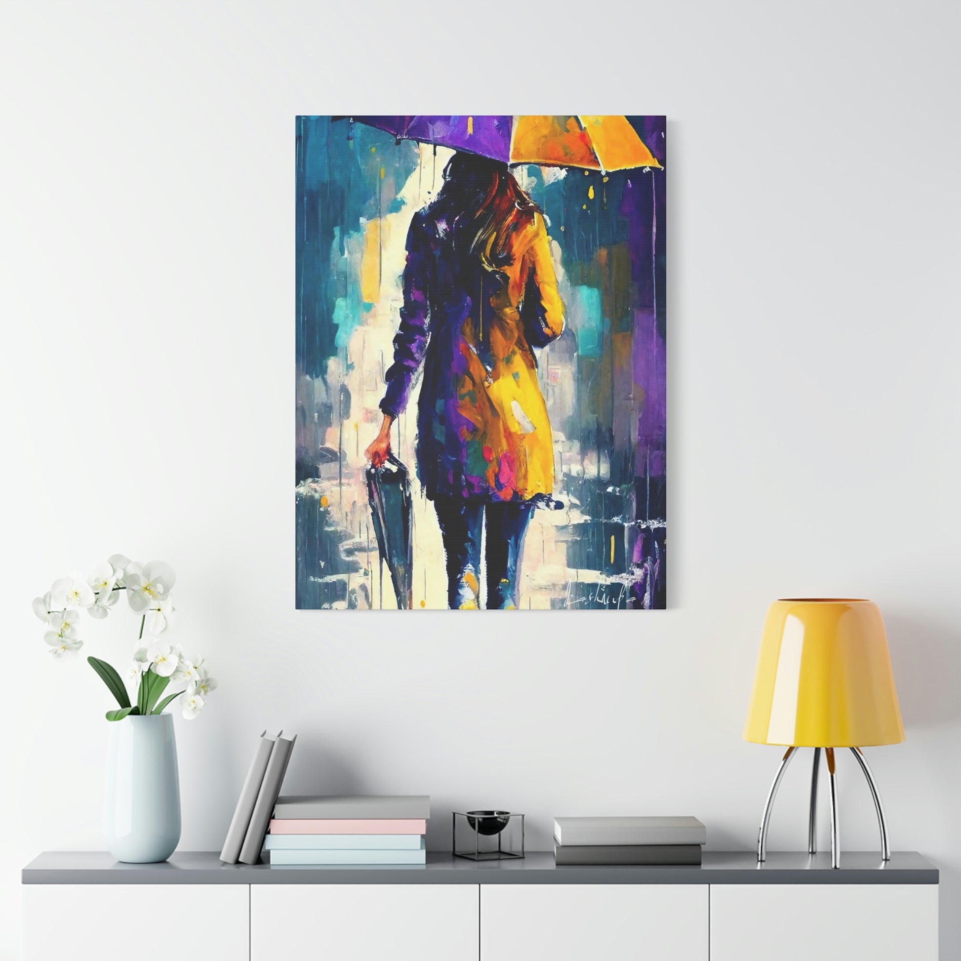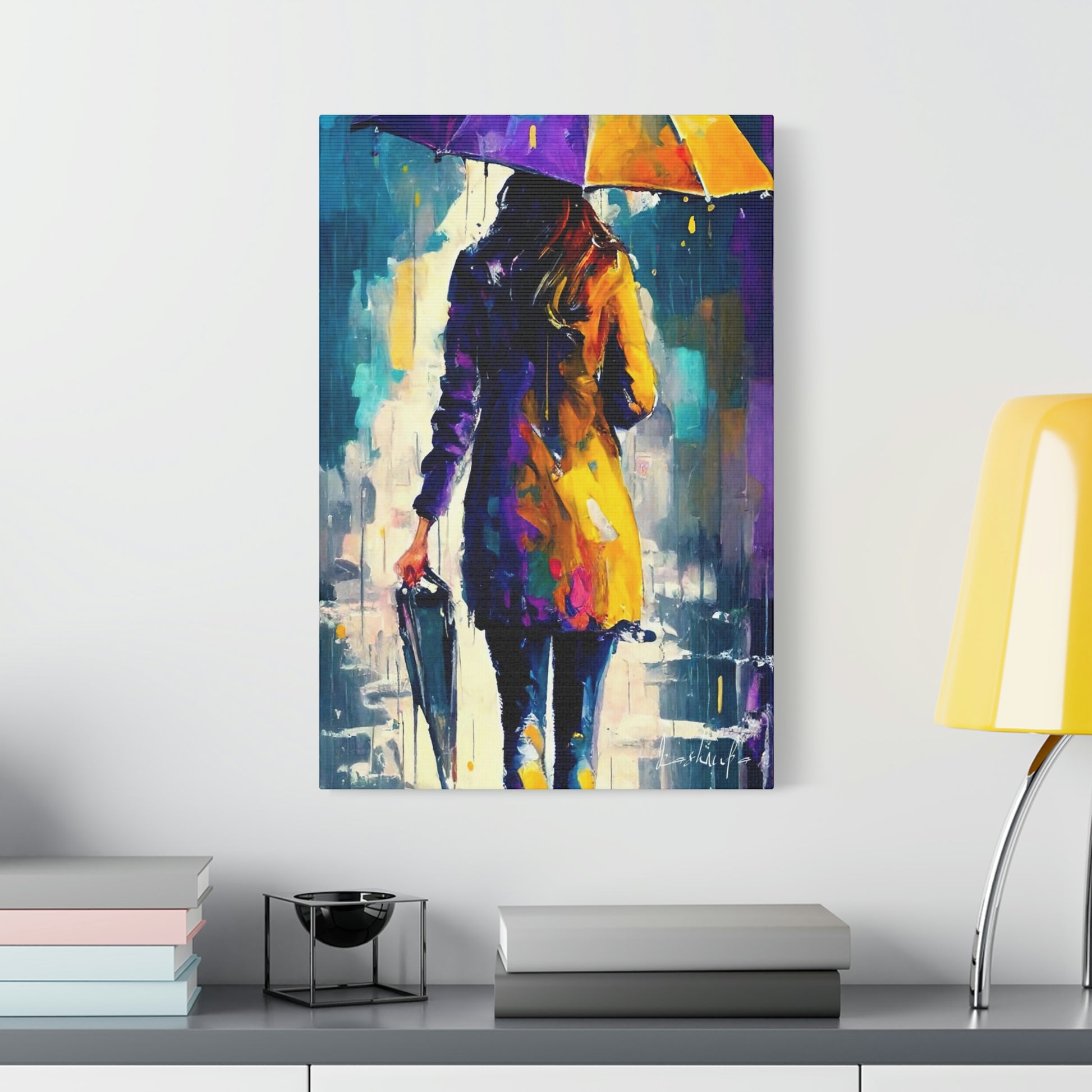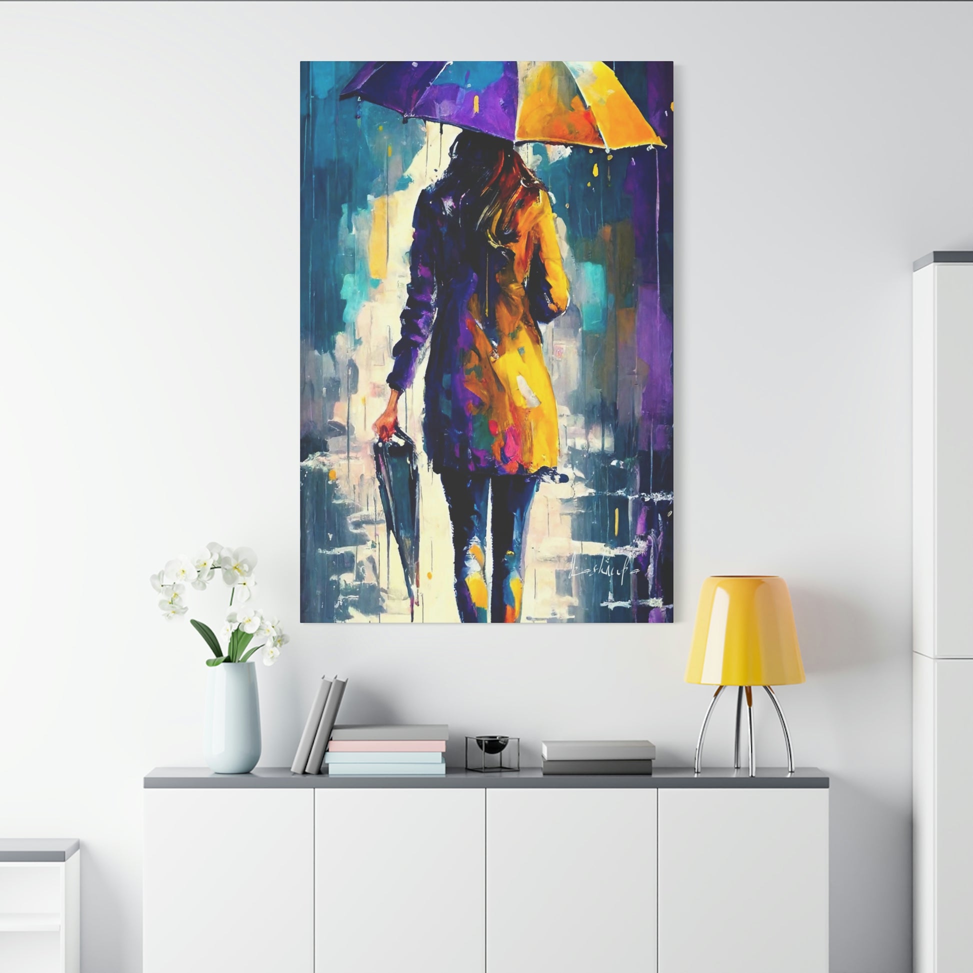 The muted colors and delicate raindrops create a peaceful and serene scene, while the bright, bold umbrella provides a pop of color and adds a touch of whimsy. This piece is a beautiful tribute to the romance of a rainy day and the simple pleasures of life.